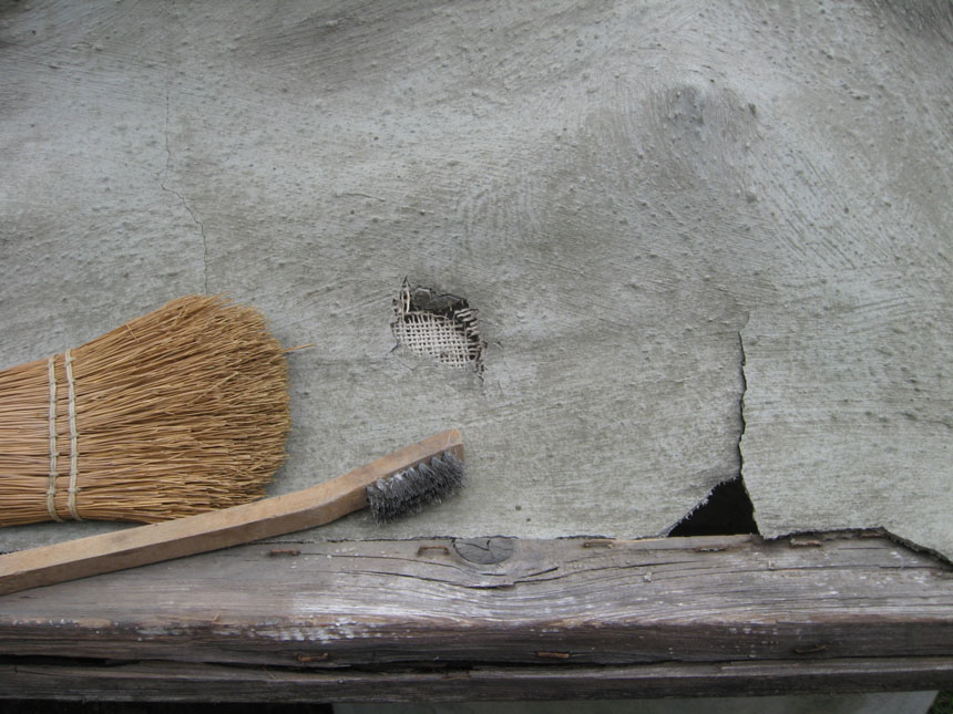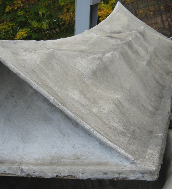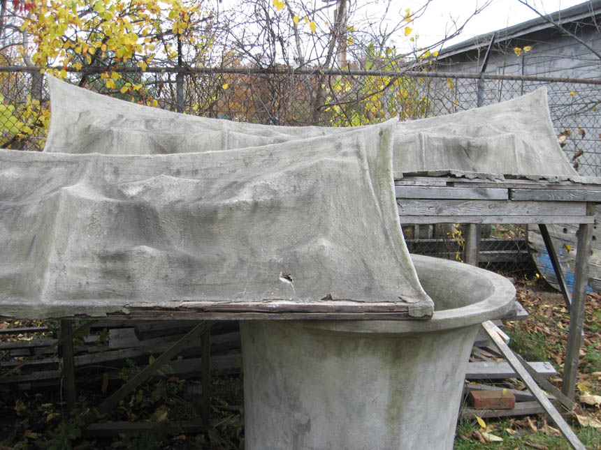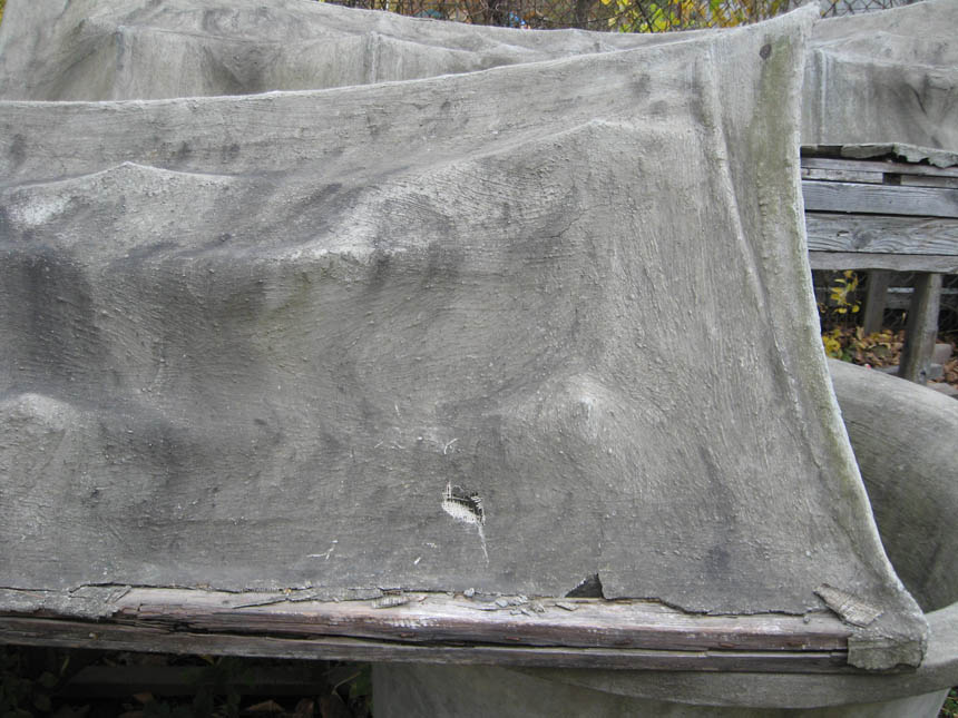 Physical access to the right side of the roof below is blocked, it is thus relatively untouched. Eight to ten year-old neighborhood children played on these roofs for the first three years, I asked the children to stay off the roofs when they grew and began to play more roughly. Burlap was simply hung over a rope, stapled to a wood frame, and then painted with construction cement mixed with acrylic; thus the portion stapled to the wood is coated on one side only and did not age well as the wood rotted beneath it.