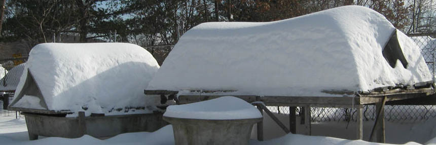 These are the first 2005 test roofs made of burlap, cement and acrylic, in their sixth winter, February, 2011.