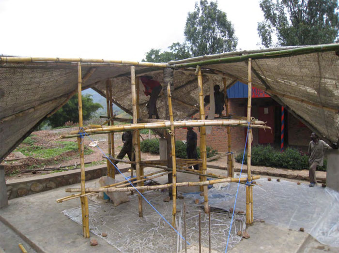 Quarter panels are thoroughly lashed to each other and the ridge poles, as well as the concrete corner posts.