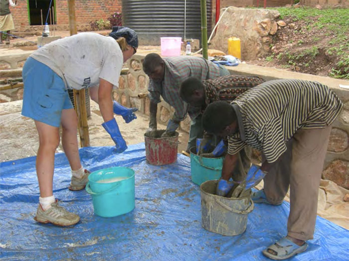 Mixing cement and acrylic by hand. It is very important that there be more than one pair of gloves for each person and that they be cleaned often. Notice the small amount of cement on the skin of the nearest persons left arm, I have old 1997 scars on the underside of my arms from abrasion at the same point, where the glove cuff chaffs the skin.