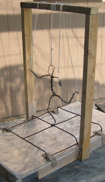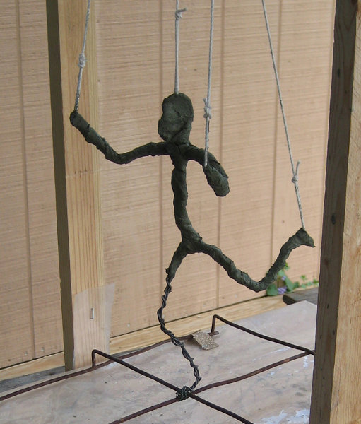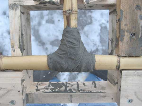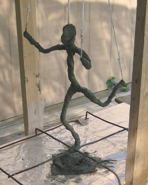 Fiber may be placed on a wire armature, shaped foam, balloons, wood, cardboard, or a bamboo frame, the list is unlimited. Two inch bamboo scraps (5 cm) make an ideal spool to hold cement soaked strips of muslin that will attach and provide dimensional foundation in ways that are also unlimited.
