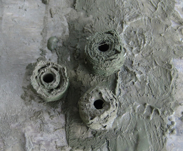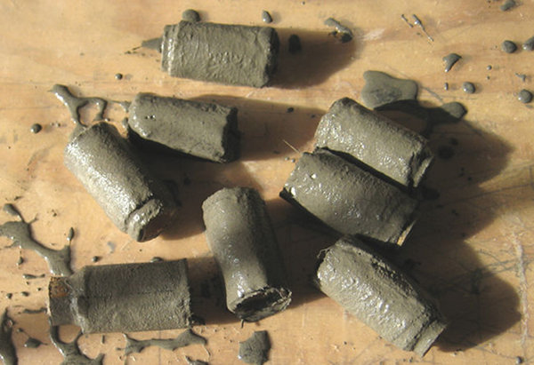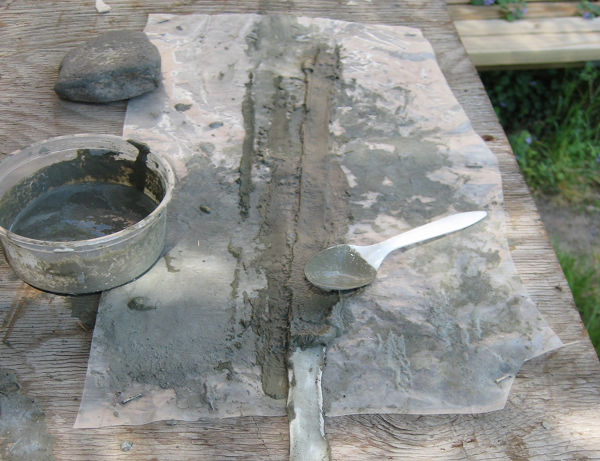 Utility grade muslin is ripped into strips, wet and drip dried to slightly damp. Apply cement and acrylic mix to one side and then the other, using almost anything as a center axle, in this case some plastic tube, make the strips into easily applied rolls.