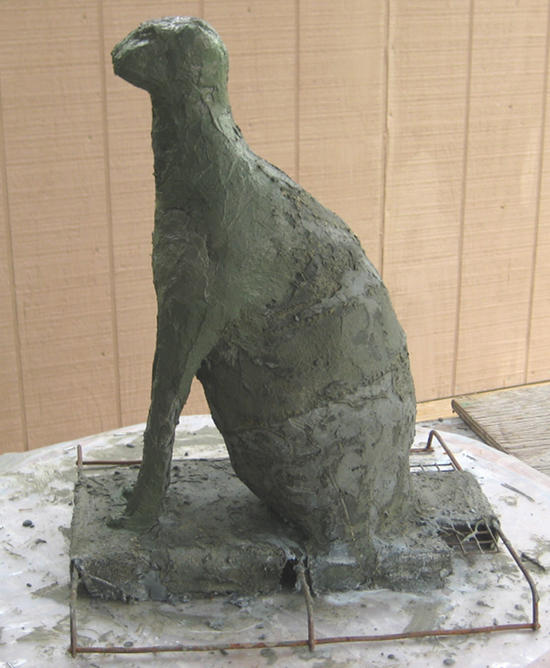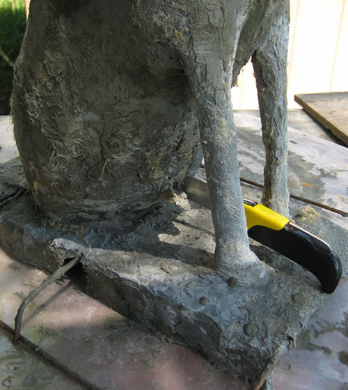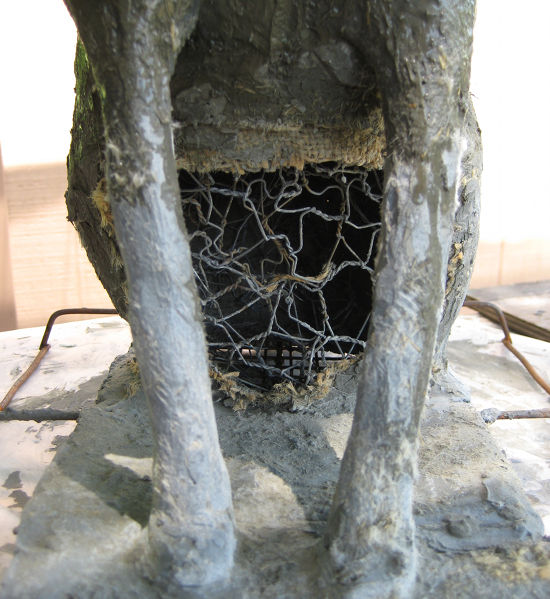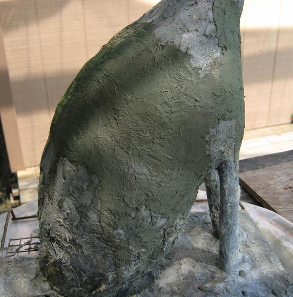 The front leg forms and the head are covered using muslin strips and the body is covered with burlap. Blending between the two is done with loose fiber soaked in cement and acrylic. Back legs and tail await further work on the base, which can be easily trimmed to fit. The front legs are partially cured at this point, they have a strength which is superior to burlap fabric. Muslin absorbs the acrylic and cement mixture and because it is thinner has more alternating layers of fabric and cement.