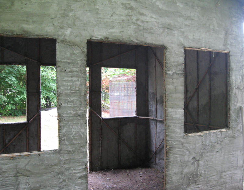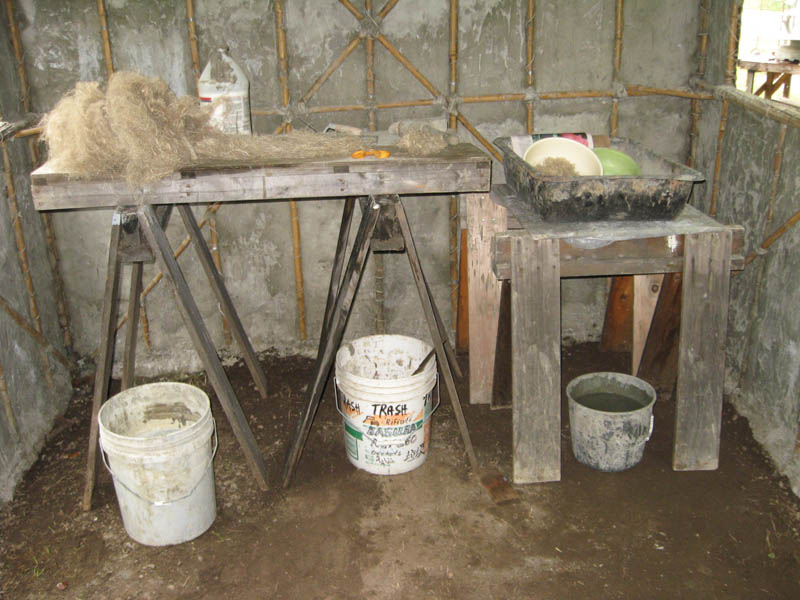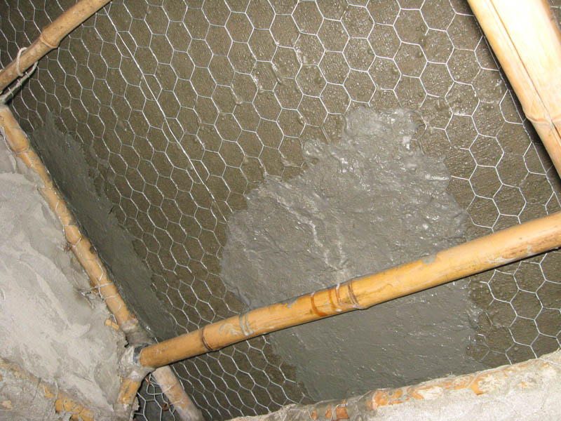 An inside layer of fabric will eventually cover bamboo and the poultry wire. Paint laden with fiber or thin plaster where woven poultry wire rip-stop is tight against underside of outer fabric layer, next, best concurrently, apply inside fabric, easiest is approximately the photo production steps. Note again the labor theory of value used here-in : all steps require much labor and little material, mucho trabajo y poquito material, muito trabalho e pouco material, beaucoup de travail et peu de matériel.