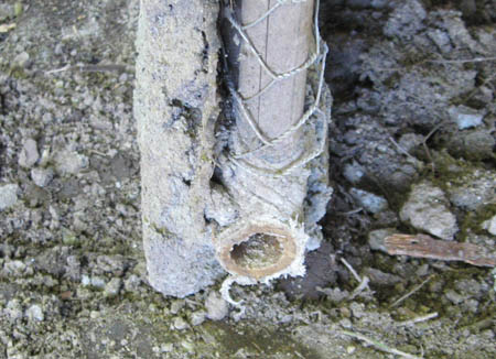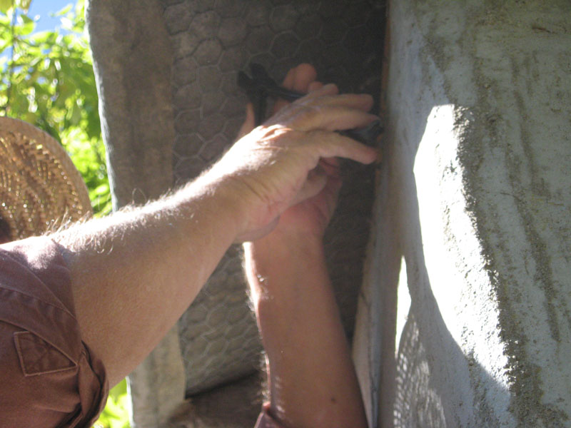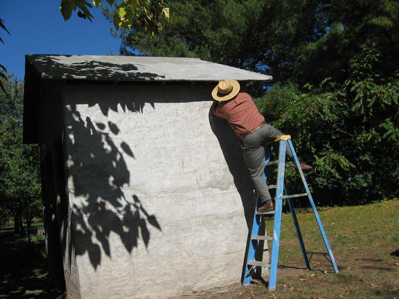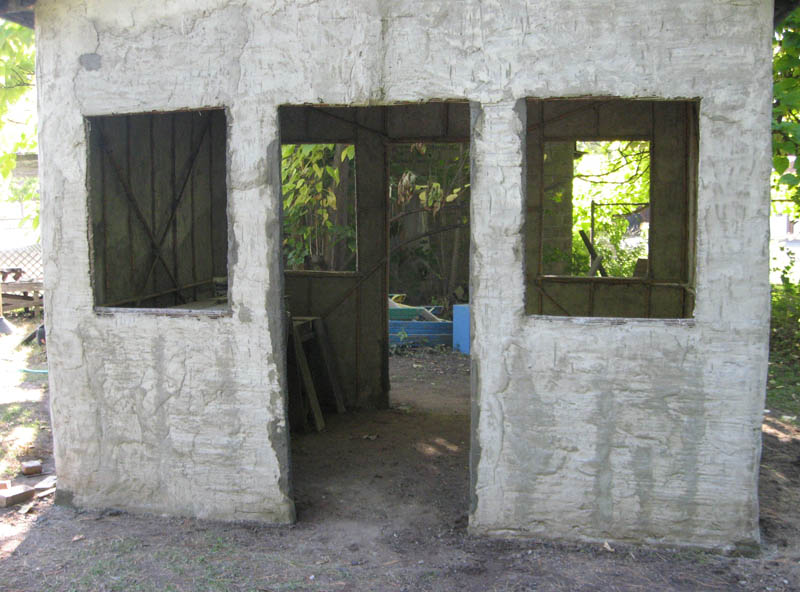 Remove the bottom horizontal bamboo frame member where it crosses the door opening. Plaster using sand mixture is once again used on the walls.