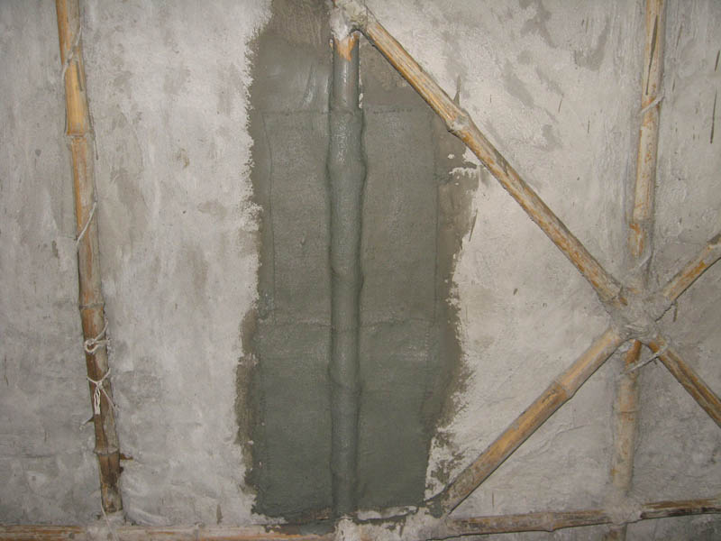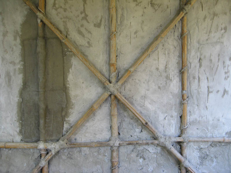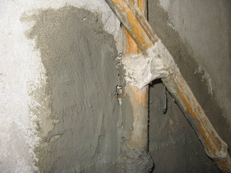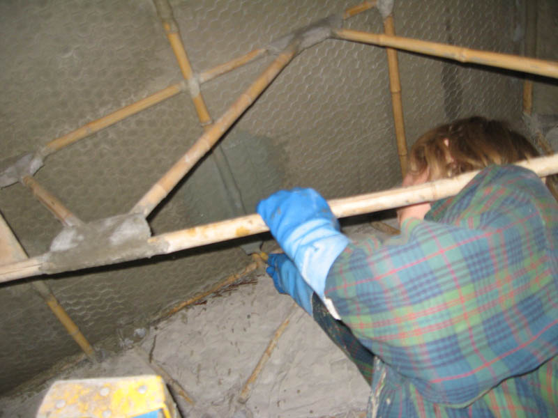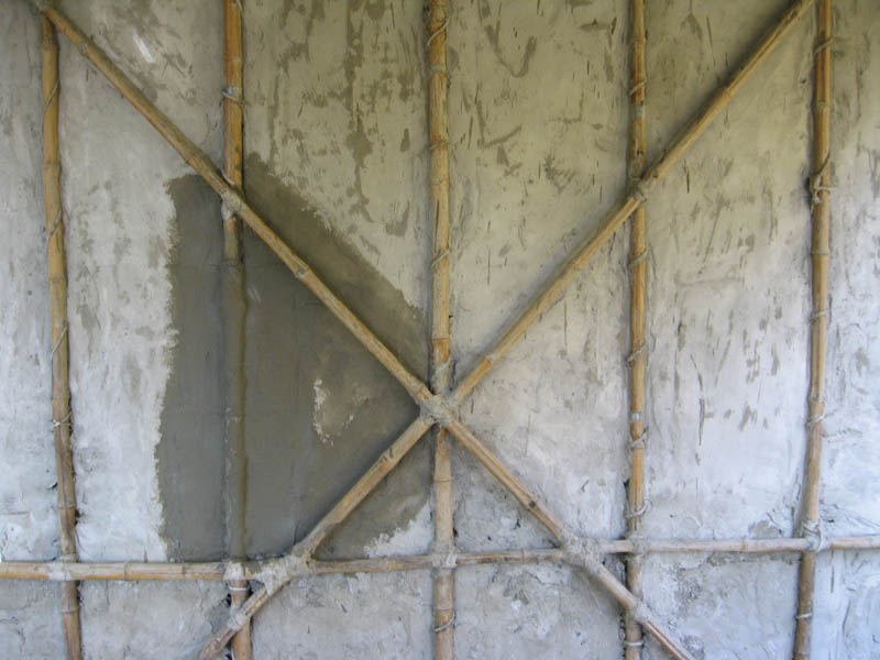 Fill minor imperfections with fiber mix before applying fabric covering layers. Notice that the angle brace creates greater distance between brace and wall membrane. This extra distance is first bridged from below with a fabric layer and then filled with fiber plaster from above. The additional demension provides for a storm resistant girder of great strength, the original 5ยข joint wrap is greater than human strength.