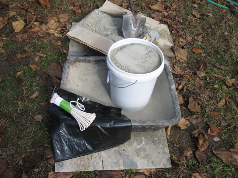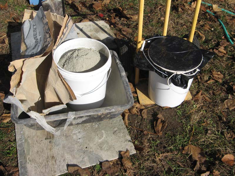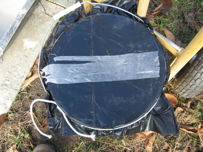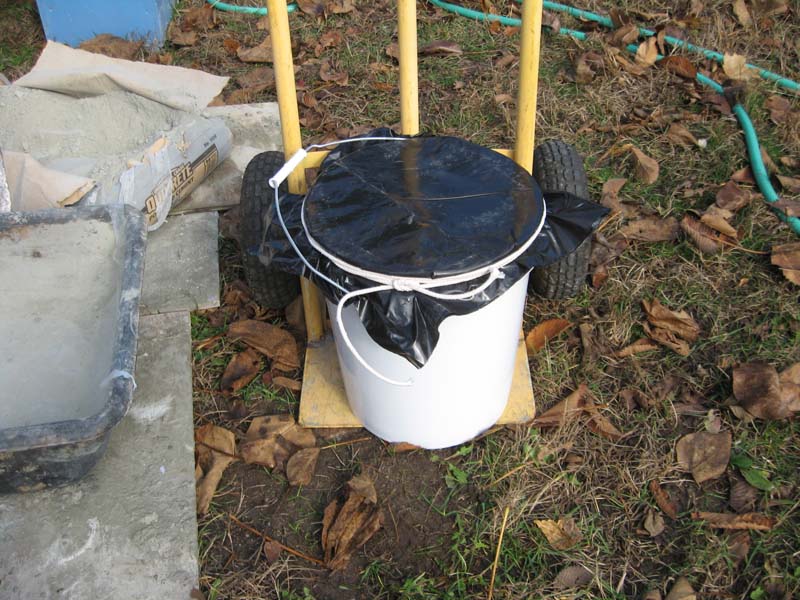 A plastic trash bag cut to fit over the top of the bucket is quickly secured with cotton rope. It is best to cut the trash bag so that two layers of plastic cover the bucket.