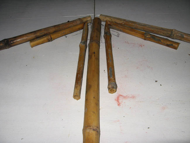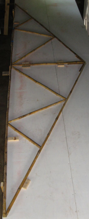 The overall height of the truss is measured from the bottom of the horizontal length of bamboo to the top of the hypotenuse lengths which define the slope. Thus, because the bamboo is of various thicknesses, the center piece will vary in length (height).