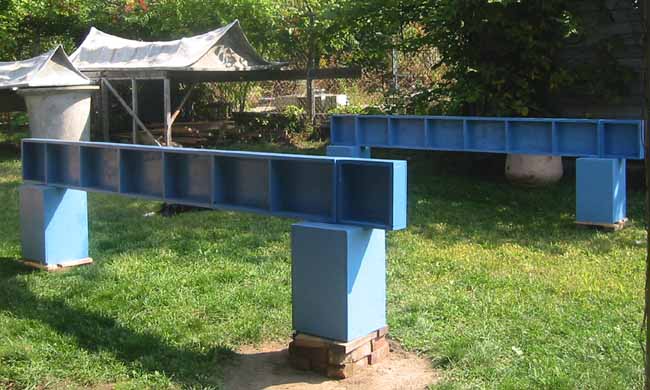 Plywood girders are positioned with exterior dimension at 3.5 meters to simulate exterior walls for example assembly. The actual roof material will not be placed until someone wants a 2.5 x 3.5 meter structure. The size is large enough to require extra permits for transport to a final site, also extra trusses could be made and the size might become three or four meters in length by 3.5 meter width.