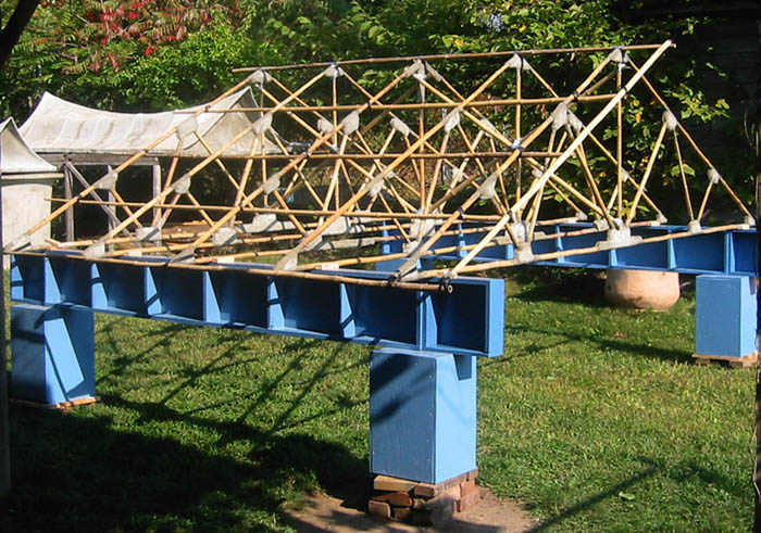 Purlins and the additional near end-wall eve are placed on one side only to illustrate construction order. Brief examination of the photo will reveal there are two "X" braces extending along the center, from end-to-end. Purlins are below the truss roof line. A tension controlled sag in each square created by the truss line and purlins will provide three dimensional strength which is not present in a two dimensional flat plain like that in the previous structure. Bamboo would be covered by strips and additional layers applied as in the previous photo series, the small shelter/shed.