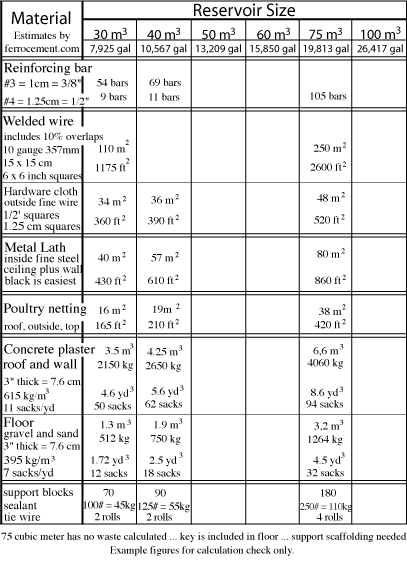 The estimate table has been filled in during various correspondences. A materials list for the 50 - 60 cubic meter range (15,000 U.S. gallons) can be found in chapter one of the tank building manual.