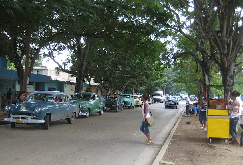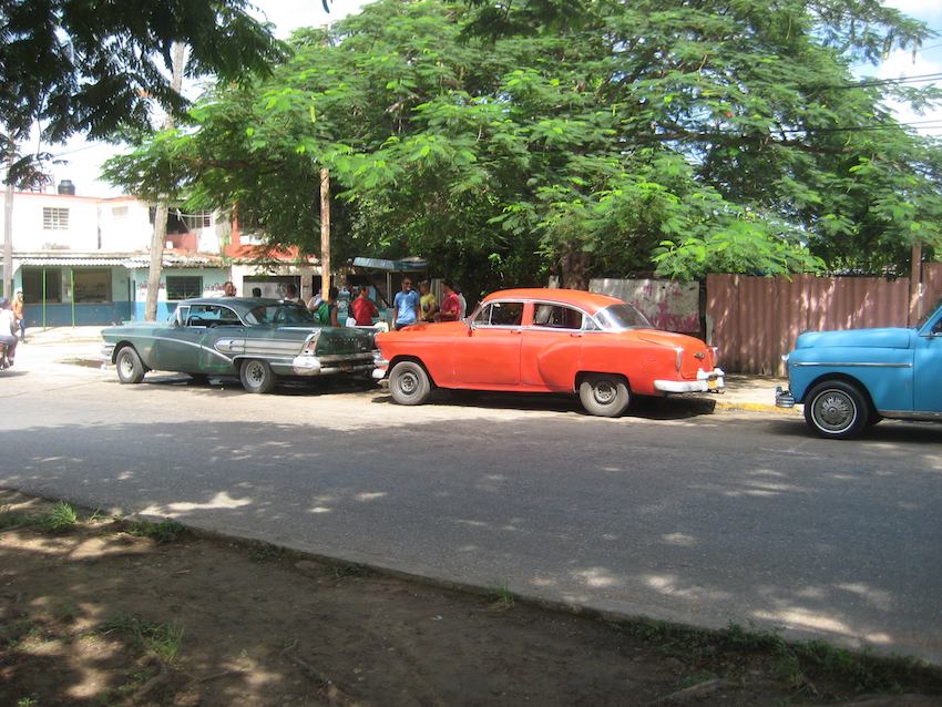 This group of taxis is one block south of the main avenue. Upon inspection one will notice that these cars sit a little higher than when new. They are all rebuilt many times and the springs are new.