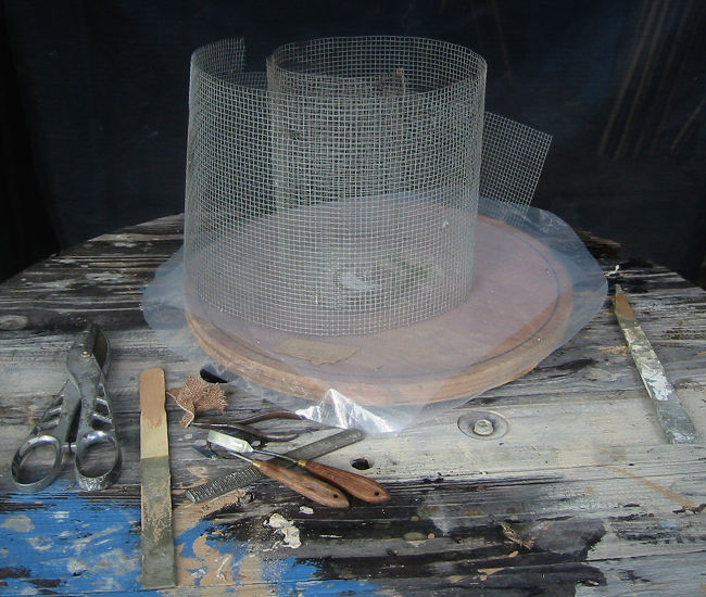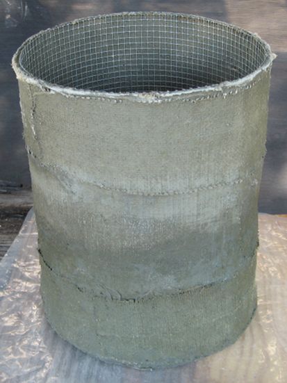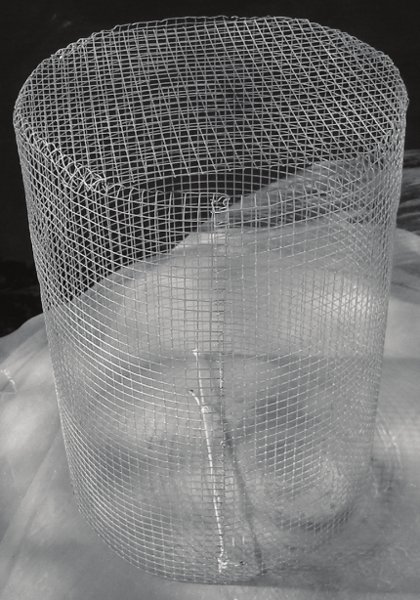 The cup experiment was tested for tone and found to be quite good. A padded stick tapped against the bottom yielded a distinct yet familiar latin sound. The percussive tone was in fact good enough to lead to the next experiment, via complex human thought patterns, "Hmm, how about a little bigger?" A balloon would have worked but a little 1/4â" square hardware cloth was within ready reach.
