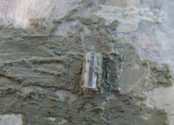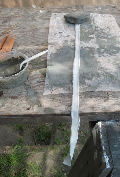 Utility grade muslin is ripped into strips, wet and drip dried to slightly damp. Apply cement and acrylic mix to one side and then the other, using almost anything as a center axle, in this case some plastic tube, make the strips into easily applied rolls.