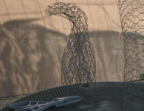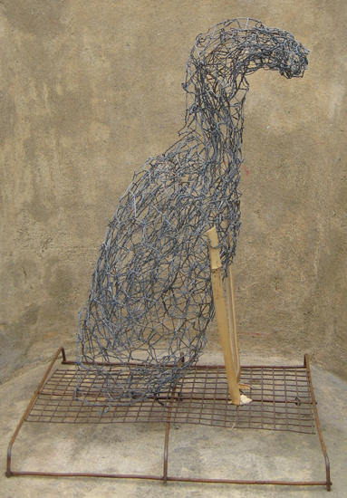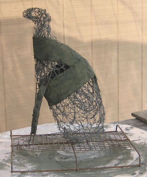 The example running figure is set aside to let the critical right leg cure and become as strong as possible. Principles of construction are reviewed next with slight variation with an example form of chicken wire. An old uncle who worked on many projects in Hollywood told me the movie industry utilized everything from foam to slinky metal fabric supported by old bottles for this sort of thing: an egyptian cat as a fiber reinforced sculpture is the next example.