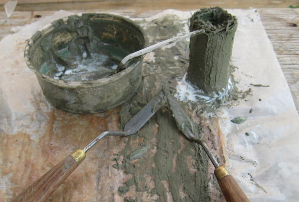 Mixed cement and acrylic have been applied to both sides of a damp burlap strip and made into a roll. The burlap soaked with acrylic and cement is then placed on the shape. Smaller muslin rolls were unwound around the front legs. The partially unwound roll on the leg has been set aside for the photo below.
