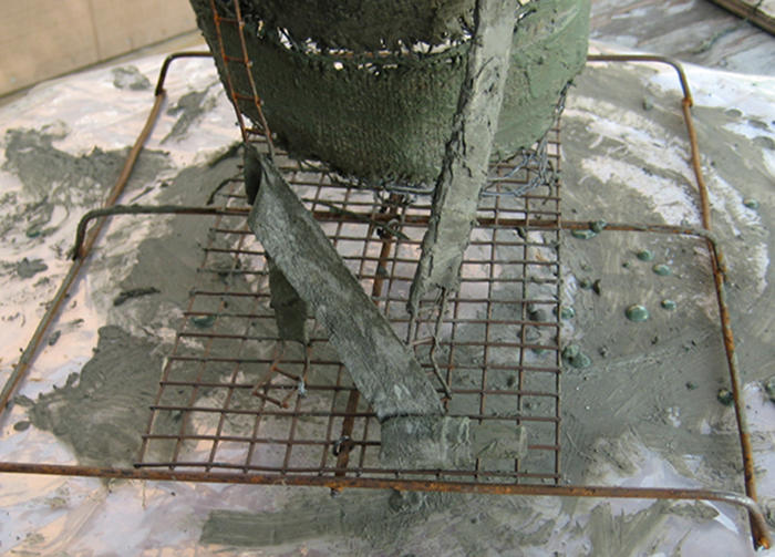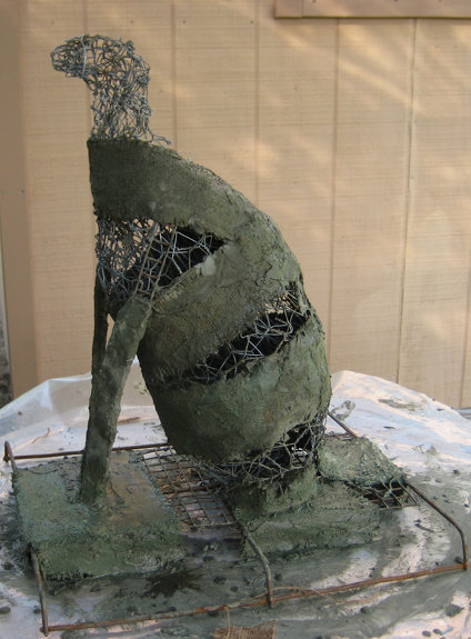 Working with cement, acrylic and fiber is a very relaxed pace compared to traditional ferrocement plaster, mainly because the cure process is less rigorous. The media does become hard with time because it is concrete, yet wrapping it in plastic and returning to work the next day is similar to how one treats clay.