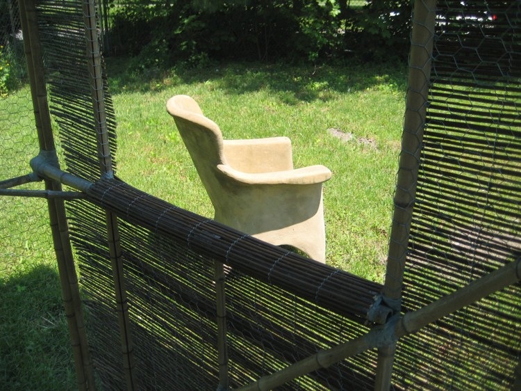 Same sheathing concept using reeds, preliminary attachment is 32 mm cotton rope (1/8") instead of wire, final attachment is cotton rope and string wrapped around the frame members. Notice that the left side is made up of trimmed scraps.