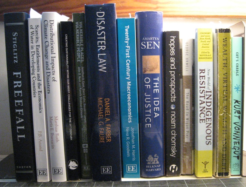Below is some 2010 reading, it does not include reading aloud fiction, Cat's Cradle is included as an example for that. Reading focuses my auto-meditations upon sustainable culture during manual labor on these shelter photos. Noam Chomsky's were read twice. "Shades of Grey" by Jasper Fforde, not shown, all finished, but barely into Disaster Law. Just finished the hilarious Hitchhiker's Guide to the Galaxy, reading aloud Cory Doctorow's interesting analysis of computer game gold and real gold as virtually the same, see, For The Win, pp.183 - 189.