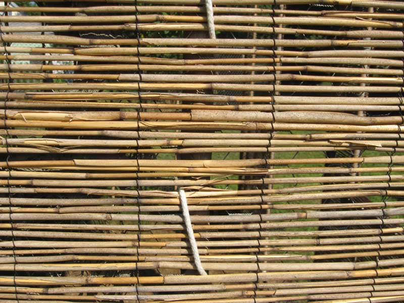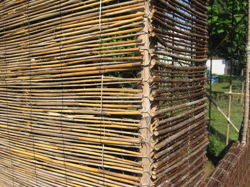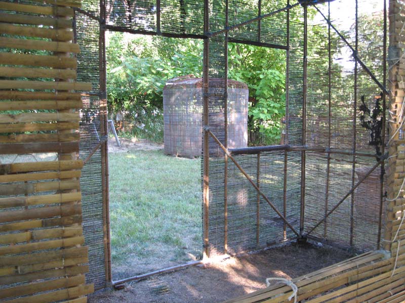 Looking through the window of a wall sheathed with split bamboo, the far corner is inside where the reed and willow meet, this is the same corner viewed from the outside in photo #3 above. The water tank armature in the background of this photo was used as the model for the ferrocement.com water tank construction manual. Here it is plain to see that the basic techniques for traditional steel reinforced ferrocement and biological fiber reinforced space-age mud and wattle style ferrocement are exactly the same.