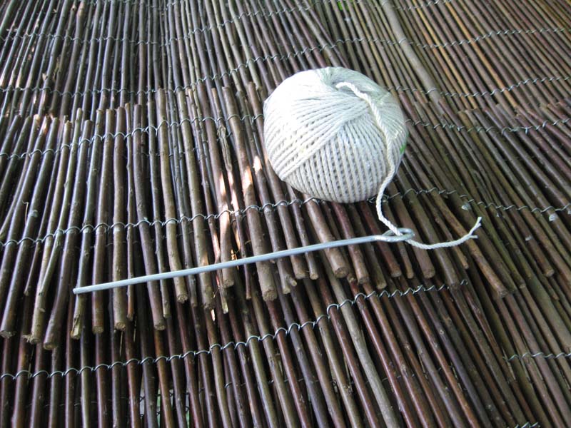 Cotton string with a made-on-the-job bent eye needle is more rapid than passing the rope back and forth but requires more attention to tension and knots. The thinest cotton rope, 32mm (1/8"), is fun to work with. Cotton string is better than nylon.