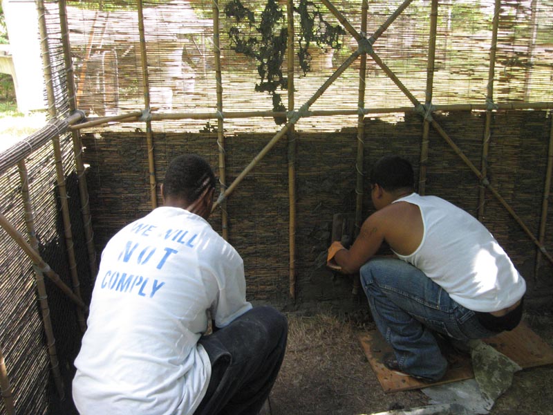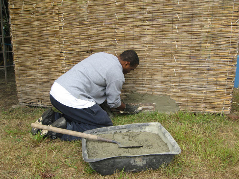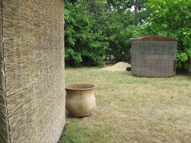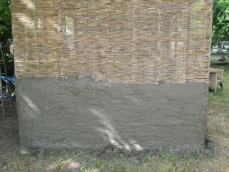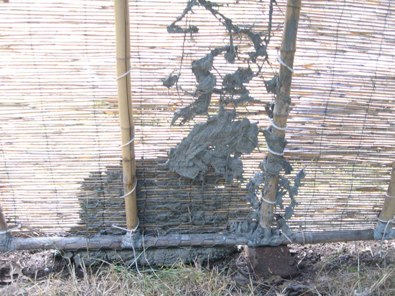 Winter was already pressing so the first goal was to simply go around and secure the bottom to window height. The reed test wall plastered as easily as the bamboo and willow sections, though reeds seem a little weak in comparison. It will be interesting to examine the various finished walls and compare strength when they are finished next spring, 2011.