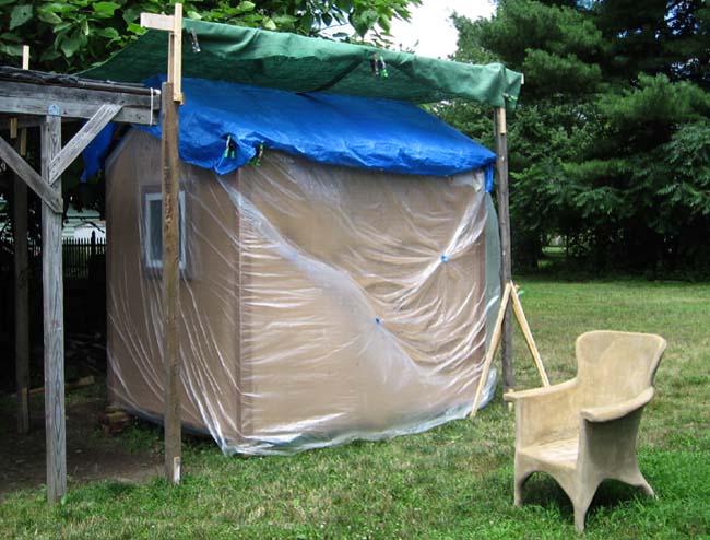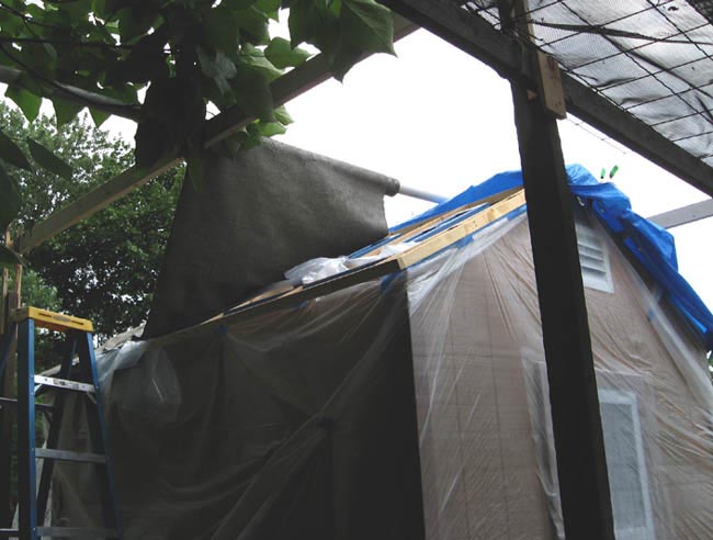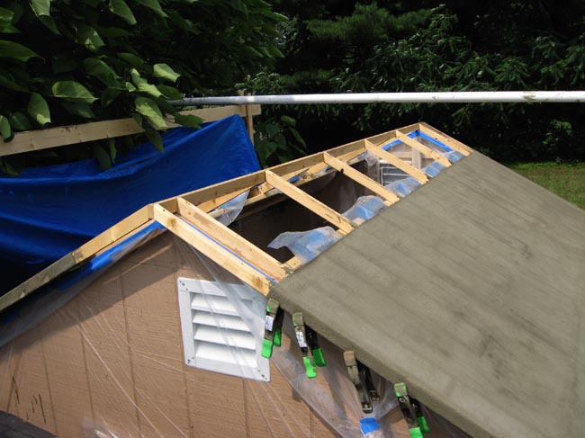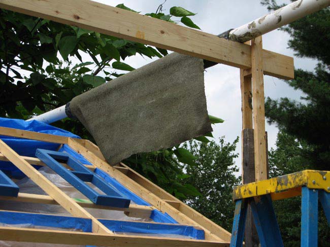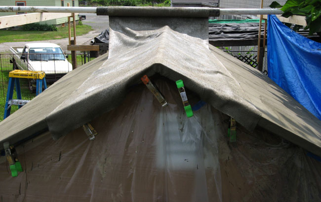 The temporary supports between rafters are easily covered with a small piece of plastic after the cloth has been placed. Slide the plastic between the support and the material so it does not stick to the temporary support. A release material such as wax was not used because it could interfere with the bond to additional material applied inside.