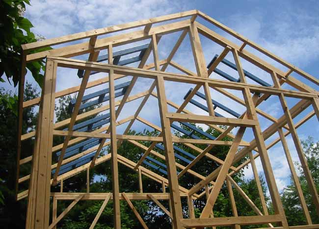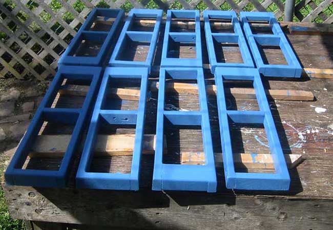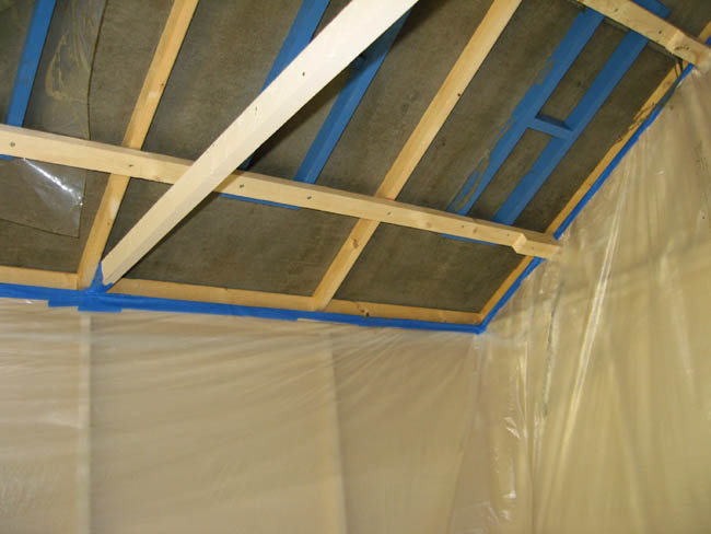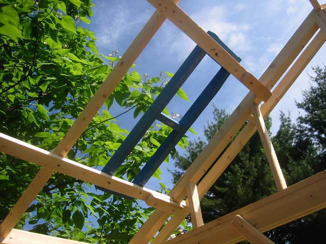 Temporary supports are painted to facilitate cleaning after use. The temporary supports are placed between rafters and are attached with screws on their own temporary support. Place screws so each part can be disassembled from below after the roof is on. These temporary supports are not necessary structurally, they simply make the finished roof flat rather than curved between the rafters.