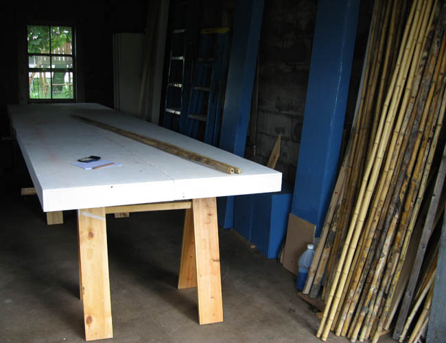 The truss to be constructed is for a roof which is 3 x 4 meters (9.8' x 13.1'). Eves will be 25 centimeters and the outside dimension of the building will be 2.5 x 3.5 meters (8.2' x 11.5'. Five trusses with a spacing of 62.5 centimeters are required (24.5"). Purlins attached under slope chord connect trusses and extend 25 centimeters beyound end walls to create end eves. This roof design will have added strength of surface deflection equal to bamboo thickness to purlins and slight sag between them.