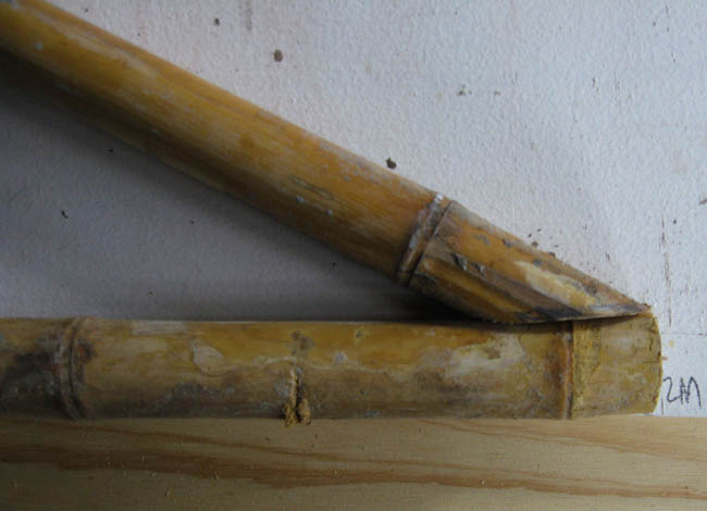The overall height of the truss is measured from the bottom of the horizontal length of bamboo to the top of the hypotenuse lengths which define the slope. Thus, because the bamboo is of various thicknesses, the center piece will vary in length (height).