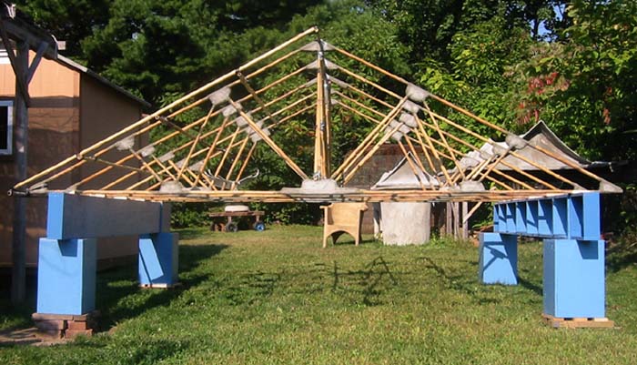 Plywood girders are positioned with exterior dimension at 3.5 meters to simulate exterior walls for example assembly. The actual roof material will not be placed until someone wants a 2.5 x 3.5 meter structure. The size is large enough to require extra permits for transport to a final site, also extra trusses could be made and the size might become three or four meters in length by 3.5 meter width.