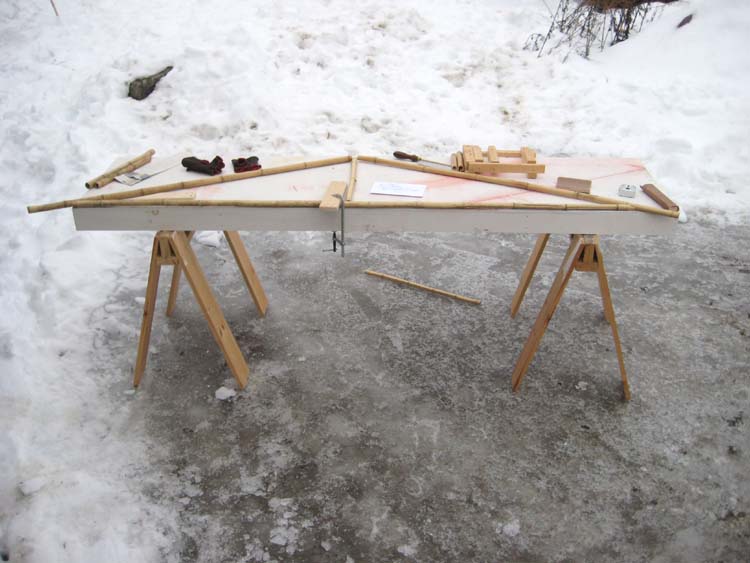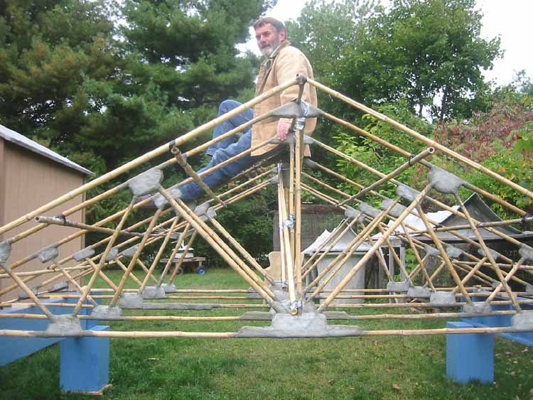 The mock truss roof assembly shown below is lightly taped together and the bamboo is old, thin-wall, low-grade and split; if it will hold me like this, it will devinitely hold a snow load when the bamboo is encased as the small wood rafters were done in previous chapters. Purlins are the connecting pieces running at right angles to the trusses. They are below the rafter chord of the truss so water flow is not impeded. The purlins are not in the exact roof plane because the dimensional sags provide dimensional strength greater than a flat plane.