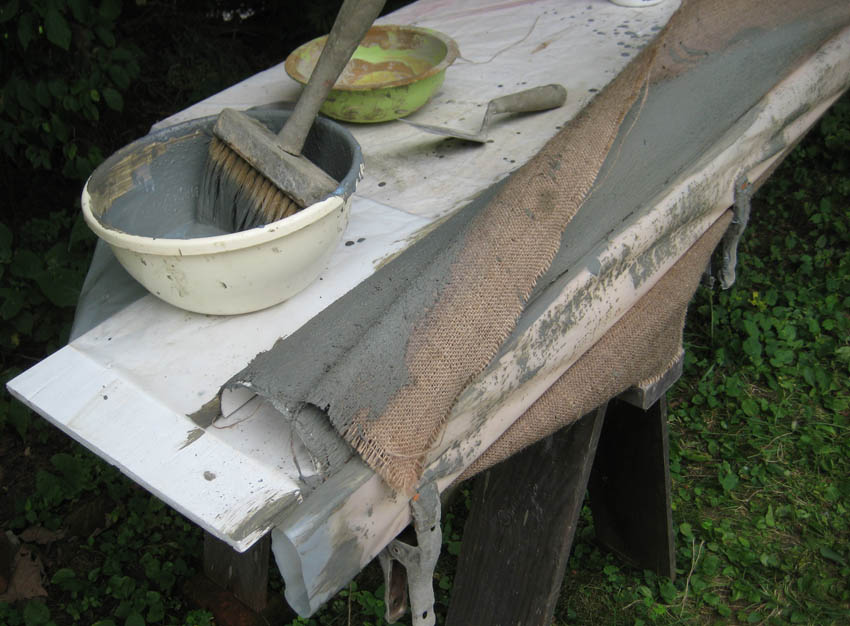 Limpie el borde, donde el cemento reforzado con tela llega a la superficie de la mesa de trabajo. Mezcla de un cemento de poco más y hacer uso de parches de fibra sueltas, si es necesario. El exceso se pueden recortar con un cuchillo afilado después de 6 a 24 horas.