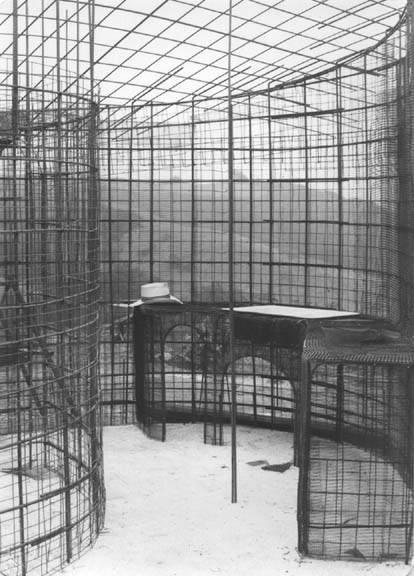 Note the center pole lying on the floor above. Metal lath was clipped to the first layer/lower of welded wire and then put on top of the rafters. Experience revealed that a well tied third and lowest layer of welded wire served well to support the expanded metal, yeilding a thin roof. See tank manual for added discussion of this topic.