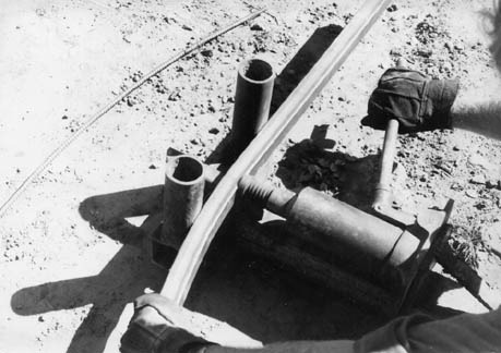 Other shapes employ parallel rafters, spaced at about one meter (39.5") Bending straight steel tubing is done by placing a new length of 3 to 4 centimeter (1 1/2"±) square tubing on top of the newly made roof plane and bending it every half meter or so with heat, space bends closer together to better match tighter curves. Old and trashed 2.5 cm water pipe has been recycled into quite a few water tank roofs (1"). Precision bends can also be made cold with a simple device made from a hydraulic jack as shown below.