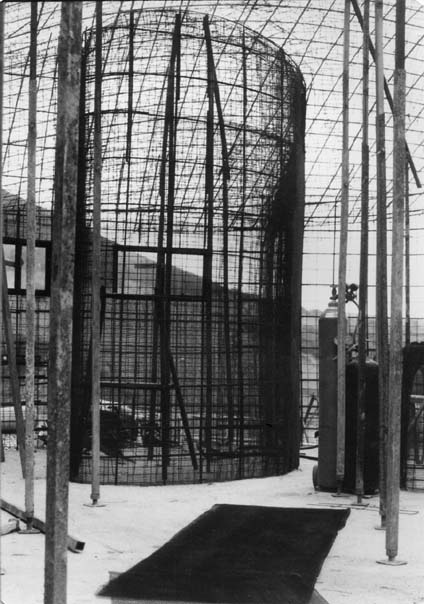 The first layer of welded wire is placed above of the rafters on this roof. This tank was built so long ago that I do not remember why this particular order was chosen. It looks as though there may have been more jobs going on than there were stanchions available. Whatever the reason, the rafters were plastered into the structure yet the armature was built as if the rafters were going to be removed. The joint at the top of the center pole indicates it was removed. Perhaps this particular roof was built with a crew that varied from day-to-day and a mistake was simply worked with.