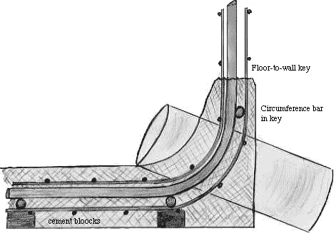 Flood the tank floor when the concrete is hard to the touch and as soon as water won’t erode it. Fill it up to the top of the floor-to-wall key. Place black plastic over the wall key so it won’t dry in the sun. Hold the black plastic in place with shoveled dirt outside the tank and a few rocks inside. Tie the plastic to vertical reinforcing steel if it is windy. Wait three or four days to start the wall steel if possible. Then keep the floor wet during construction of the rest of the tank.
