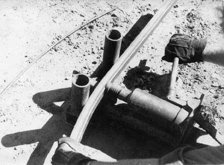 A 45 by 60 centimeter piece of welded wire is the inside lowest layer (in the above photo). It has been darkened to make it more visible. A person on top of the tank ties wires carefully passed upward by a companion working below. It is an effective way to support the inside layer of expanded metal in the ceiling. This method creates a thin roof without sags, it can help save many kilograms of cement.