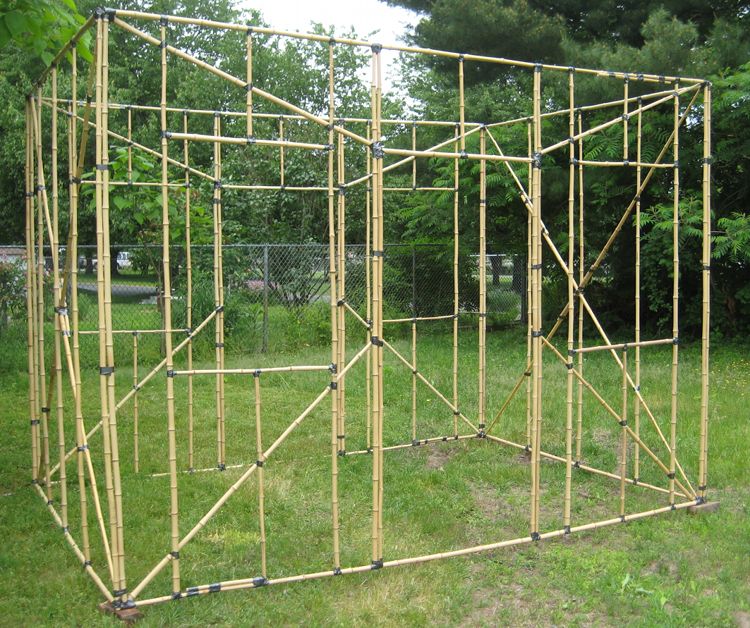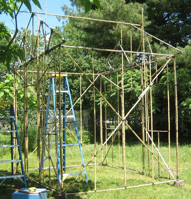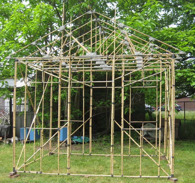 Approximately forty-five pieces of Bamboo, three Meters long (10') have been used to make these wall frames. The example is 8.4 M2 of floor area; 135 M of bamboo Ö 8.4 M2 = 16 meters of bamboo per square Meter of floor area. The equivalent figure in feet is 450' of bamboo Ö 90.4 ft2 of floor area = 5' of bamboo per square foot of floor area.