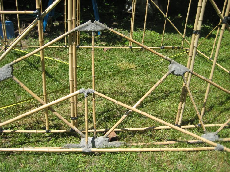 The larger truss joints were made burrito style, a burlap wrap sandwiches a filling of hemp or flax fiber. The smaller truss, two Meters, is bound with utility muslin soaked in a binder and wrapped around the bamboo, like a bandage. Wrap joints cost between 2 and 5 cents each and are superior to the the burrito style, both may be fabricated using various binders. Cure time ranges from 1/2 hr, for modern exotics, to three or four days before preliminary, gentle construction positioning and assembly are possible, using standard cement and acrylic as the binder, Space-age mud and wattle. Standard construction grade cement slurry will also work, remembering that 28 moist days is the ideal cure time for common high quality construction cement, medium warm weather.