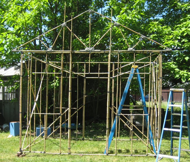 These are trusses from earlier explorations, construction photos have been published in greater detail in the ferrocement.com manual series, or in various sections of this website, see welcome page listing. The larger size truss spans four Meters, these trusses were a prior test, made several years ago from bamboo removed from an even older test. The example shelter is sized to fit the existing trusses, allowing a 25 cm overhang (± 10").