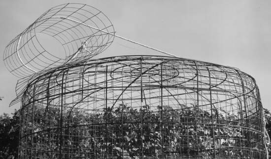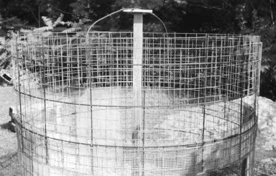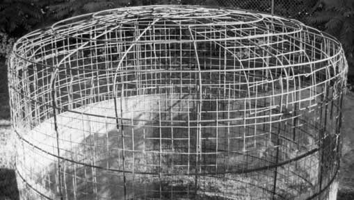Κάνετε τρεις κύκλους #3 του φραγμού (διάμετρος 30 ..60 και 90 εκατ.), καμία ανάγκη για την τελειότητα. Δέστε αυτούς τους ομόκεντρους κύκλους στην κορυφή, στο κέντρο. Βάλτε αρκετό ενωμένο στενά καλώδιο για να τελειώσετε μέσα την εσωτερική στέγη. Κόψτε οκτώ κομμάτια #4 του φραγμού που είναι 7 έως 15 εκατ. μακρυά από το κεντρικό σημείο και επεκτείνουν 45 εκατ. μετά από τον τοίχο, εξετάζουν ενός πρίν κόβουν το υπόλοιπο.