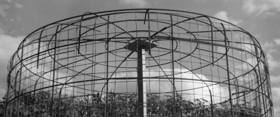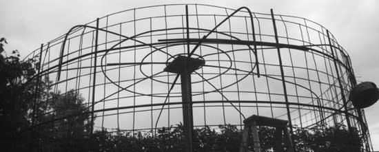 Υποστηρίξτε κάθε ακτίνες με το ελαφρύ ξύλο ή το μπαμπού, είναι βέβαιο ότι ο κύκλος δεξαμενών δεν είναι διαστρεβλωμένος στην κορυφή πριν από να δέσει ασφαλώς. Κάνετε τους κύκλους διαμέτρων 1,25, 1,6, και 2 μέτρων #3 του φραγμού και τους δέστε στην κορυφή. Επιθεωρήστε ακόμα μια φορά για την κορυφή της τελειότητας κύκλων, εάν μια ακτίνα στεγών προκαλεί τη διαστρέβλωση, το χαλαρώνει και δένει πάλι. Παρατηρήστε ότι το επόμενο σύνολο ακτίνων δεν φθάνει στο κέντρο. Περικοπή για να διατηρήσει ένα πλέγμα ενισχύοντας φραγμών 30 έως 40 εκατ.. Χρησιμοποιήστε το σωρό απορρίματος φραγμών ενίσχυσης που τελειώνει από τους φραγμούς στεγών.